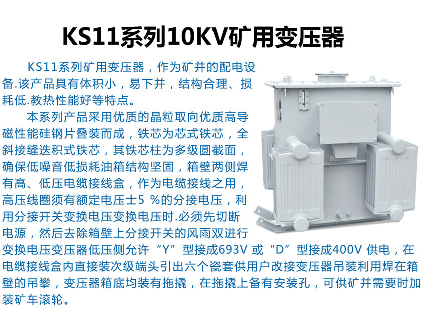 KS11變壓器適用于煤礦井下中央變電所、井底車場、總進風道和主要進風道,雖有瓦斯但無爆炸危險的場所。也適用于隧道比較潮濕的環境中
